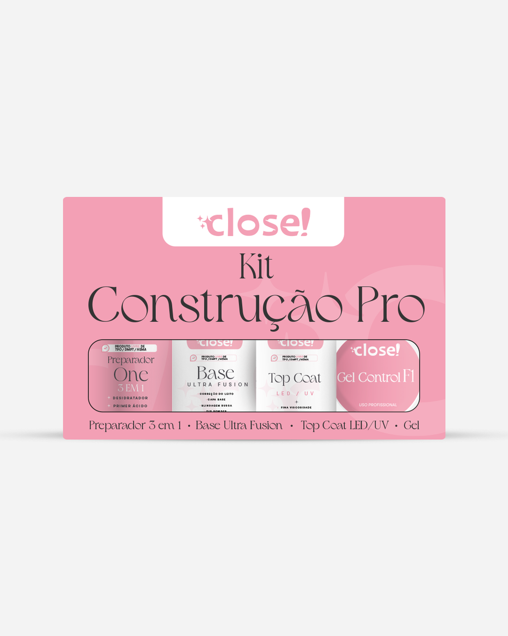 O Kit Construção Pro Close! reúne os produtos essenciais para um alongamento e construção de unhas completos, seguros e duradouros.
